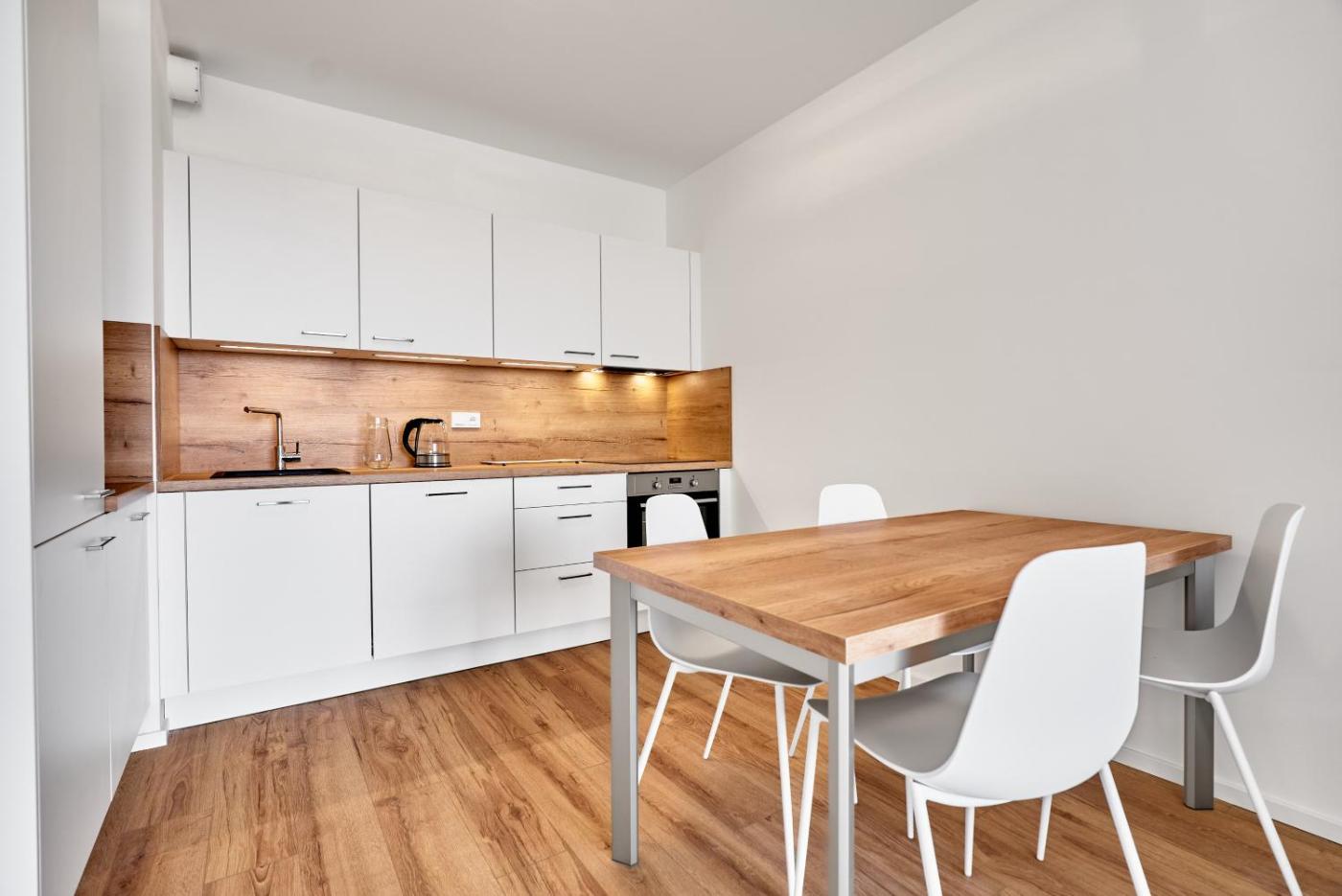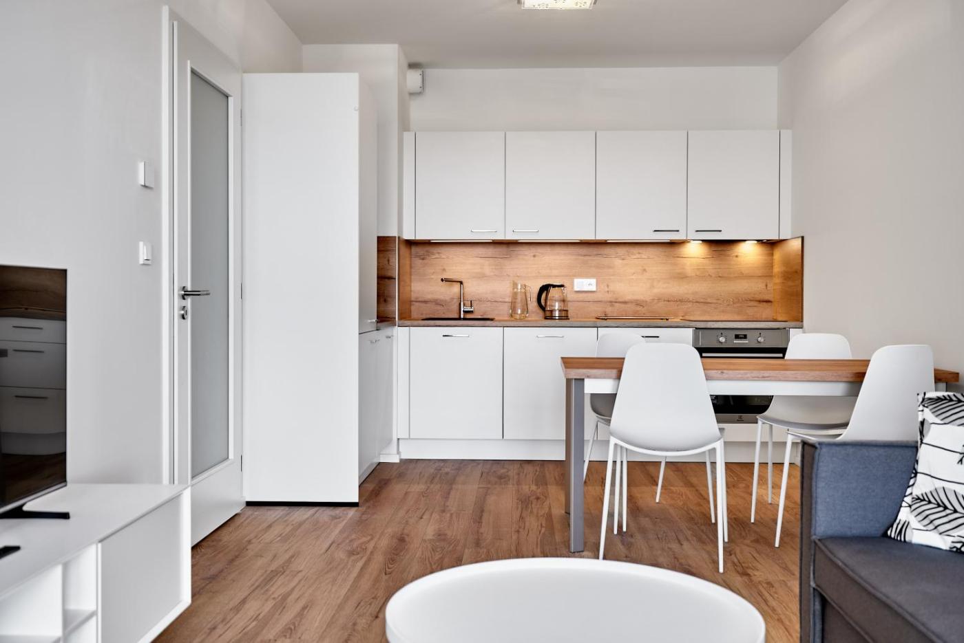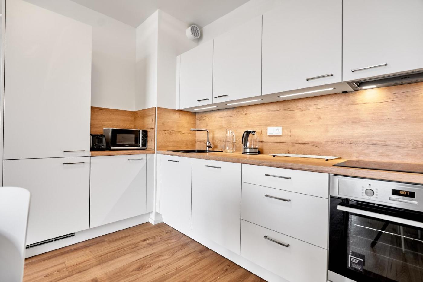 One-Bedroom Apartment. This apartment comes with 1 living room, 1 separate bedroom and 1 bathroom with a shower. In the well-fitted kitchenette, guests will find a stovetop, a refrigerator, kitchenware and an oven. The apartment features a washing machine, a tea and coffee maker, a wardrobe, heating and a flat-screen TV. The unit has 2 beds.