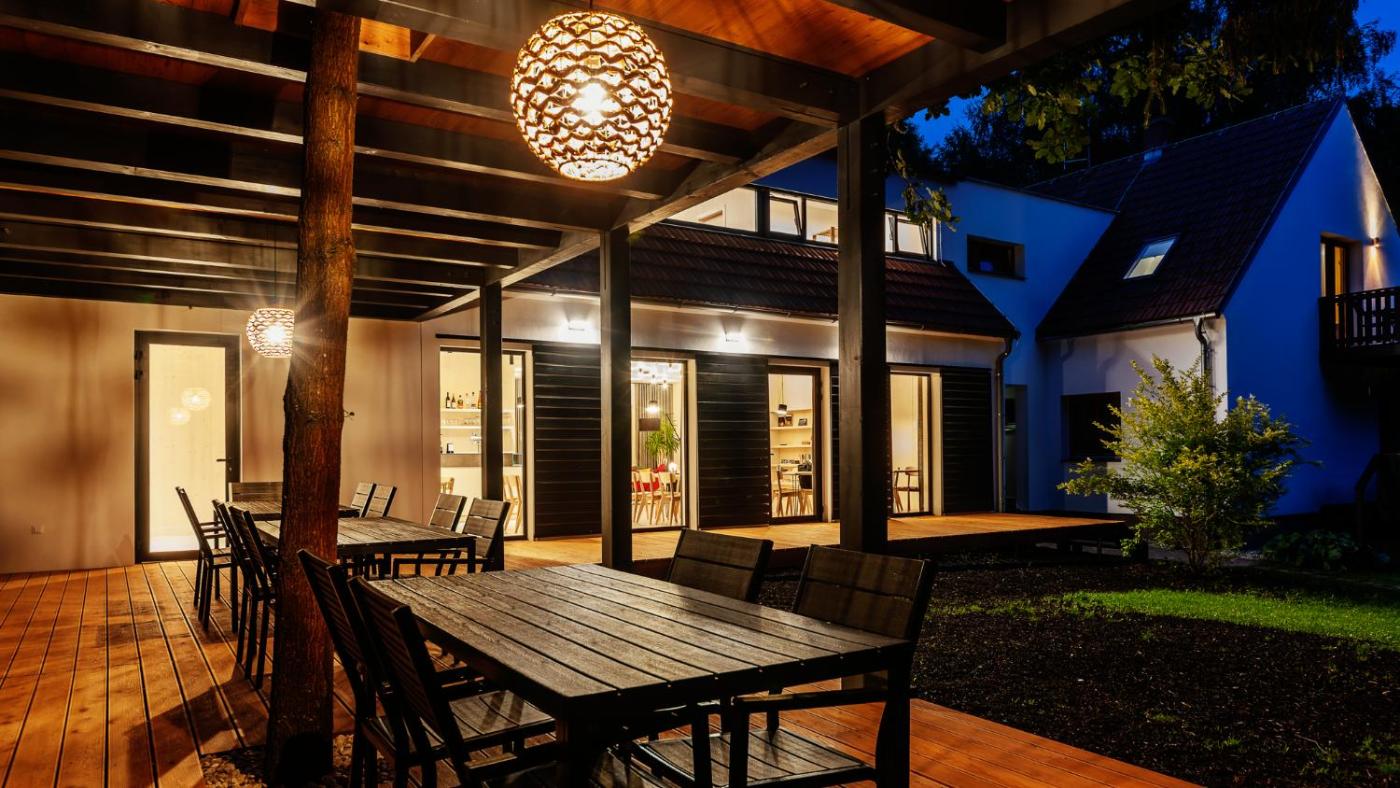 Three-Bedroom House. This holiday homes special feature is the sauna. Featuring a private entrance, this holiday home comprises 1 living room, 3 separate bedrooms and 3 bathrooms with a bath and a shower. Guests will find a stovetop, a refrigerator, a dishwasher and kitchenware in the well-equipped kitchen. The holiday home also provides guests with a barbecue. The holiday home features parquet floors, a seating area with a flat-screen TV, soundproof walls, a dining area as well as garden views. The unit offers 7 beds. ;