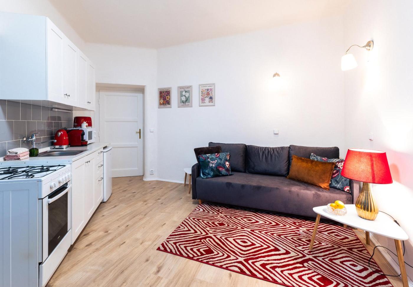 One-Bedroom Apartment. This apartment consists of 1 living room, 1 separate bedroom and 1 bathroom with a bath. The fully equipped kitchen features a refrigerator, kitchenware, an oven and a microwave. The apartment provides a tea and coffee maker, a seating area, a wardrobe as well as a balcony with a quiet street view. The unit offers 3 beds.
