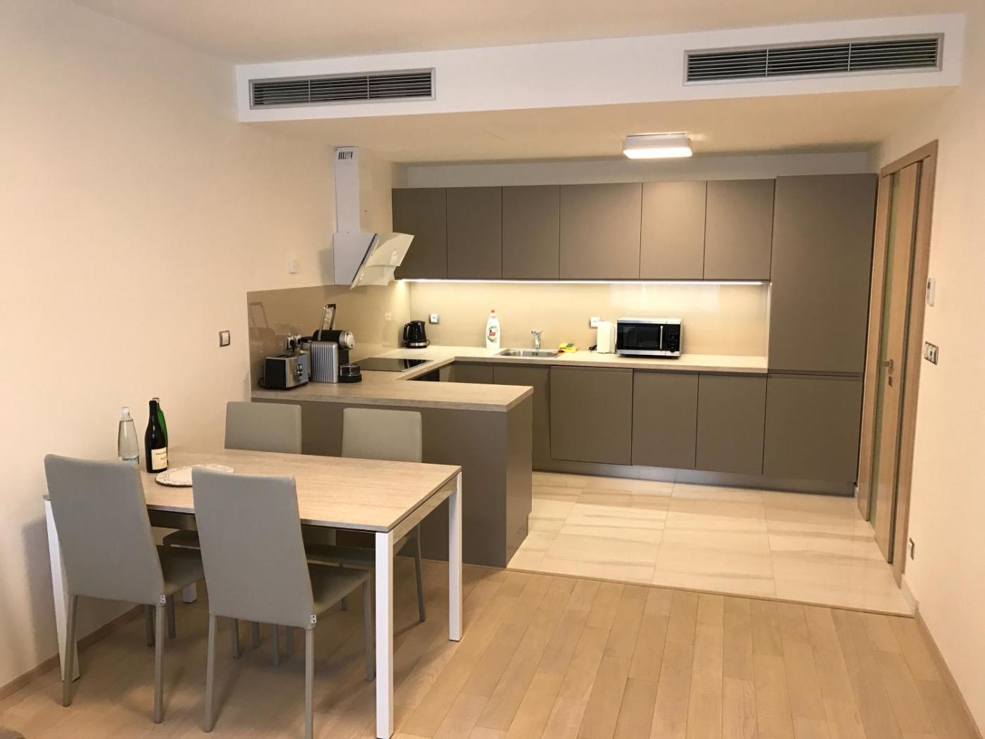 One-Bedroom Premium Apartment. This apartment is comprised of 1 living room, 1 separate bedroom and 1 bathroom with a bath and free toiletries. The well-fitted kitchen features a stovetop, a refrigerator, a dishwasher and kitchenware. The air-conditioned apartment offers a flat-screen TV with streaming services, soundproof walls, a tea and coffee maker, a seating area as well as city views. The unit offers 1 bed.